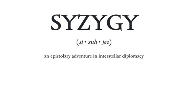 A dialog-only interactive fiction game where you play the role of Diplomat Calliope, charged with maintaining good relations with the planet Syzygy.